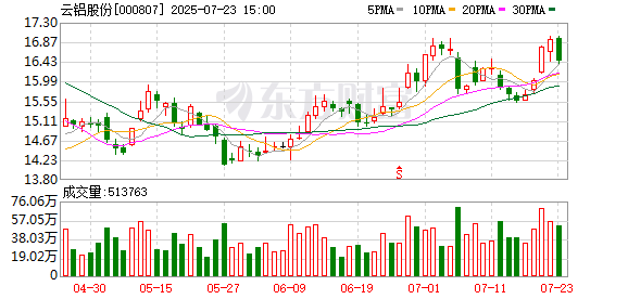 南方财经7月23日电,云铝股份(000807.SZ)发表投资者关系活动记录表公告称,公司电解铝生产线今年以来稳定运行处于满负荷生产状态。由于云南省来水偏丰,电力供应情况较好,预计不会受到限电限...