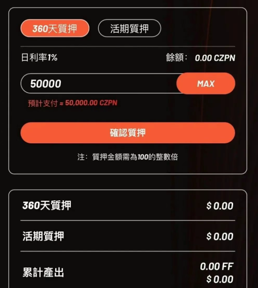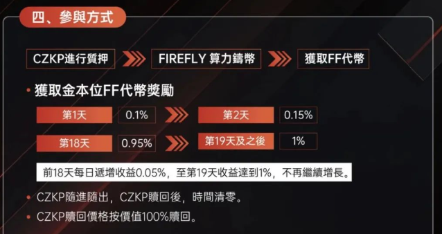项目宣称用户质押平台代币CZKP即可获得FF代币奖励,收益按日递增,第19天起日化达1%(年化3678%)。举例称,若投入1000U且FF币价涨10倍,首月收益达4000U。