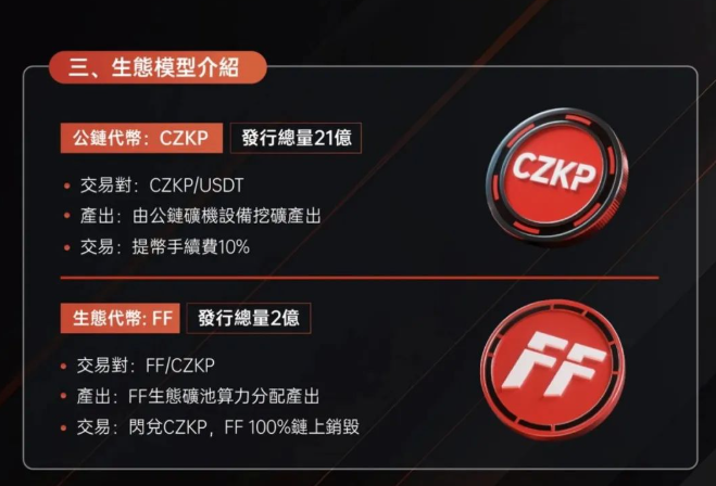 FF(生态币):总量2亿枚,用户质押CZKP挖取FF,卖出时需闪兑CZKP并100%销毁,制造通缩升值假象。