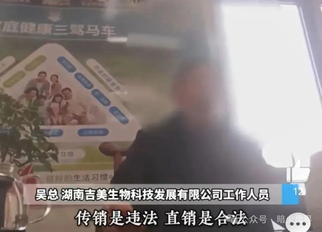 报道称,在湖南吉美生物科技发展有限公司,工作人员直言不讳地告诉记者,要想发财就得“拉人头”!甚至亲自给记者展示,仅仅拉了7个人,什么都不做,一天就能收入15000元,只要介绍的人够多,最多能拿140万!当记者质疑这是不是传销时,吉美工作人员毫不避讳称他们就是做传销出来的,只是他们公司有了商务部颁发的直销许可证,就披上了直销这个合法的外衣,模式都一样。