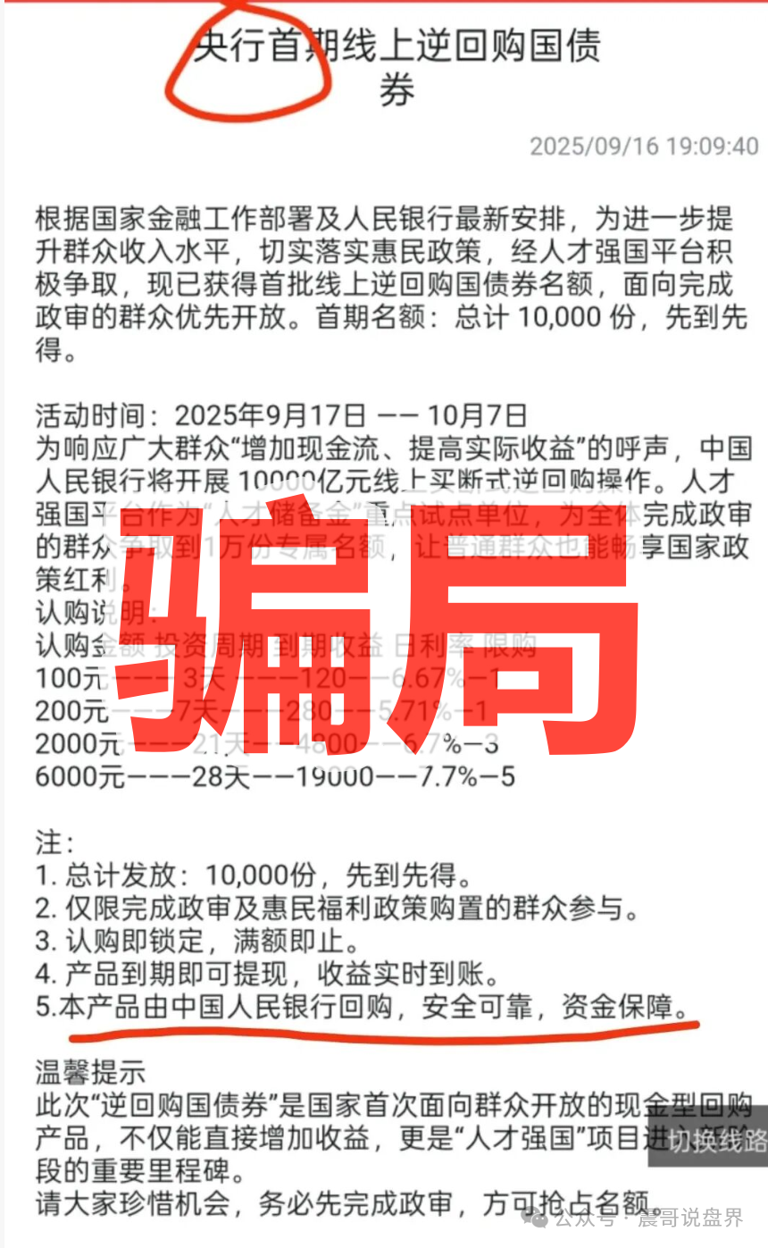 最近有个叫"人才强国"的资金盘特别猖狂,打着中国人民银行的旗号到处骗人。震哥今天必须给大家扒一扒这个骗局,免得有人上当。这帮骗子是真敢编啊!说什么央行回购、政审名额,全是扯淡。...